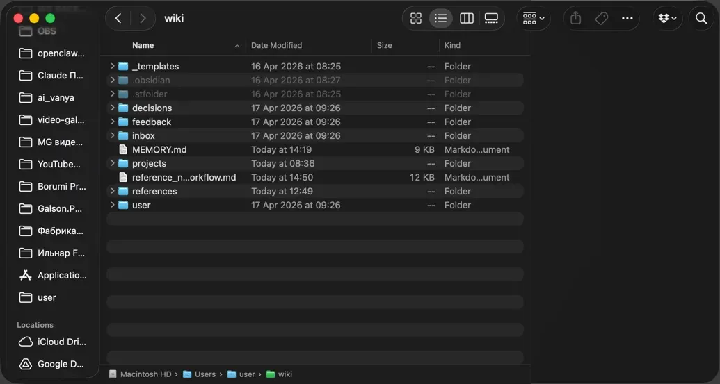 **Wiki-память** — Markdown-файлы в ~/claudecode/wiki/. Синхронизация между Mac и сервером (VPS — виртуальный сервер в облаке) через Syncthing (syncthing.net) — бесплатная программа которая держит папки одинаковыми на всех устройствах