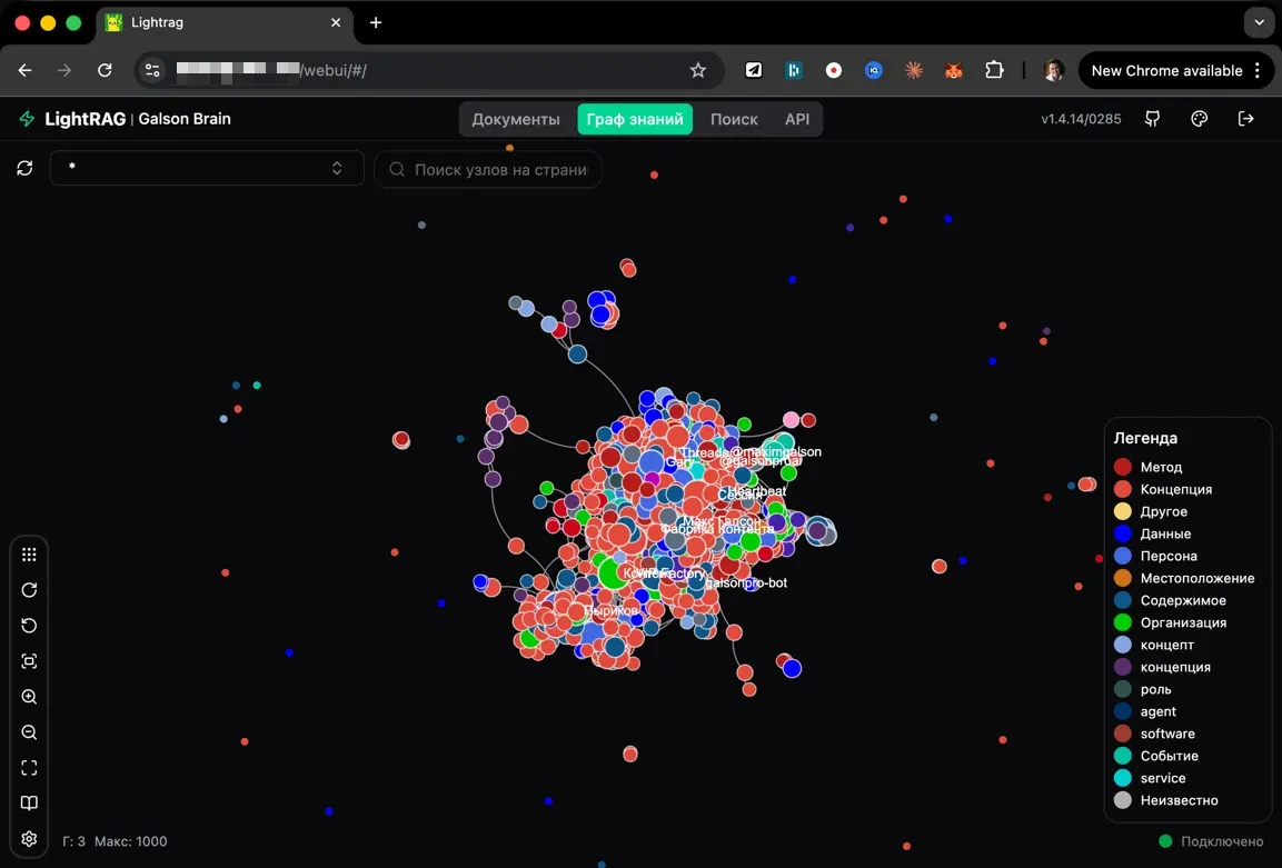 Пример из моей настройки. Когда я правильно подключил хуки, база наполнилась почти в 4 раза (114 документов → 430+). Стало ясно что раньше я просто не писал в память регулярно. Сейчас каждая сессия сама пишет в Wiki и LightRAG, сама читает на старте. Граф сущностей видно на graph.galson.pro. Память растёт без моего участия — это и есть рабочий feedback loop.