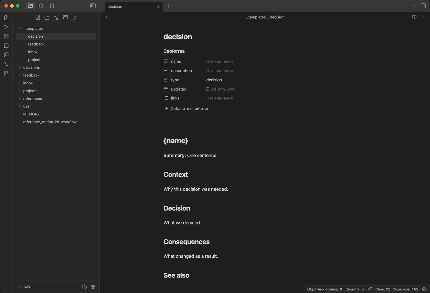 Решения остаются найденными. Ты выбрал стек, понял почему так, потом столкнулся с неочевидными последствиями — wiki запомнит и контекст, и причину. Через полгода не нужно вспоминать «а почему ты так решил».